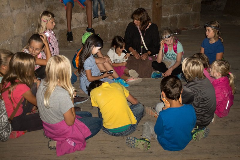 Im Schein der Taschenlampen kletterten sie die endlos scheinenden Stiegen hinauf und hinunter und erfuhren spannende Einzelheiten zu Funktion und Geschichte des alten Gemäuers. Atemlos lauschten sie den Geschichten von Alltag, Sagen und Märchen rund um Burg und Wöhrsee. Gerade die ganz Kleinen zeigten sich besonders neugierig und furchtlos.