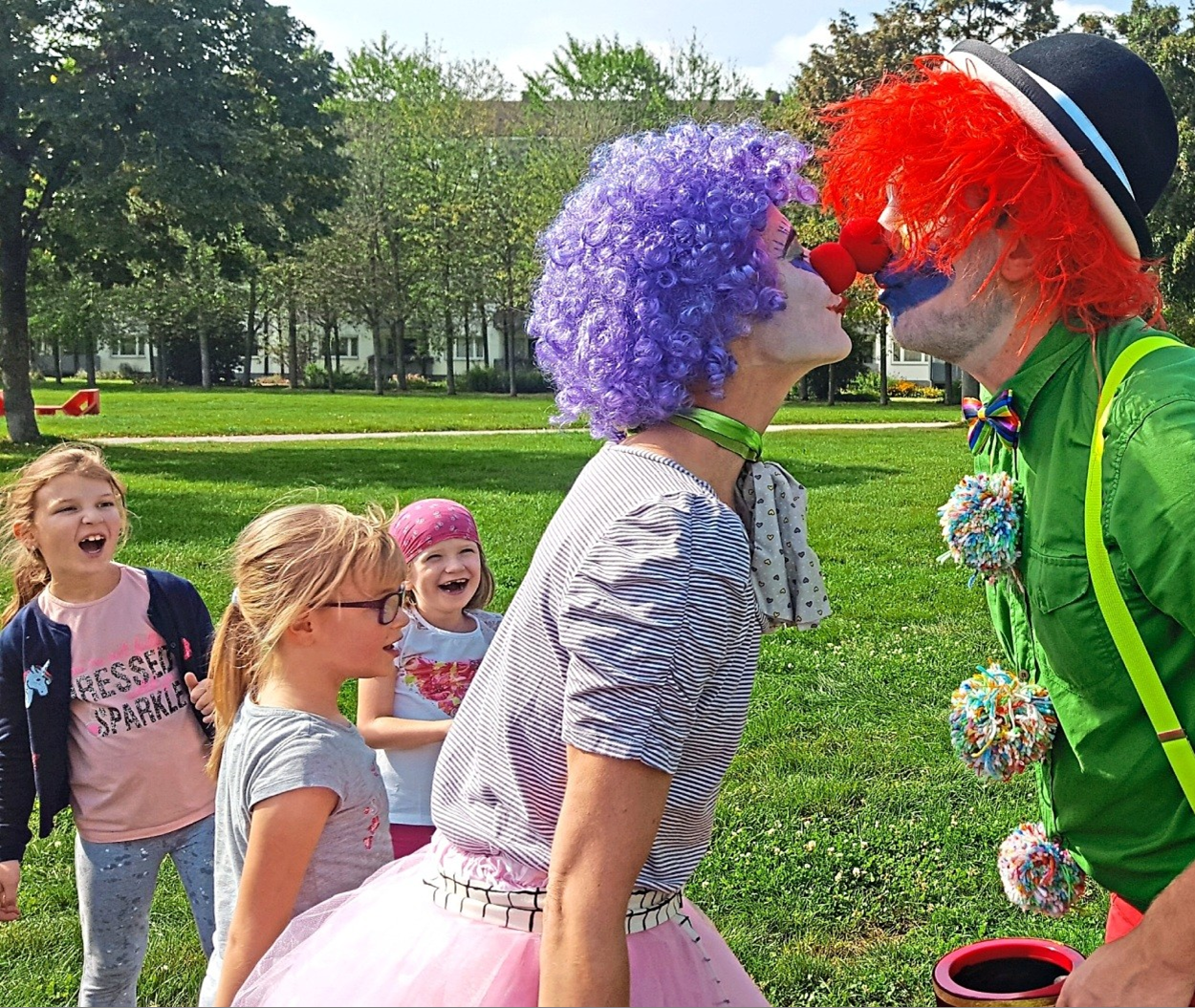 „Es ist der Wahnsinn! So viele Kinder und Eltern, die zusammen spielen, kreativ sind und Spaß haben und das alles bei herrlichstem Spätsommerwetter“, freut sich Monika Lengyel vom Freizeitheim der Stadt Burghausen, die mit einem Dutzend jugendlicher Helfer vom Spielmobil angerückt ist, um den Weltkindertag möglichst bunt und vielseitig zu gestalten. In ihrer Rolle als Clowndina brachte Lengyel mit ihrem Clownspartner Marcel Anslinger die jungen Besucher zum Staunen, quietschen und lachen.