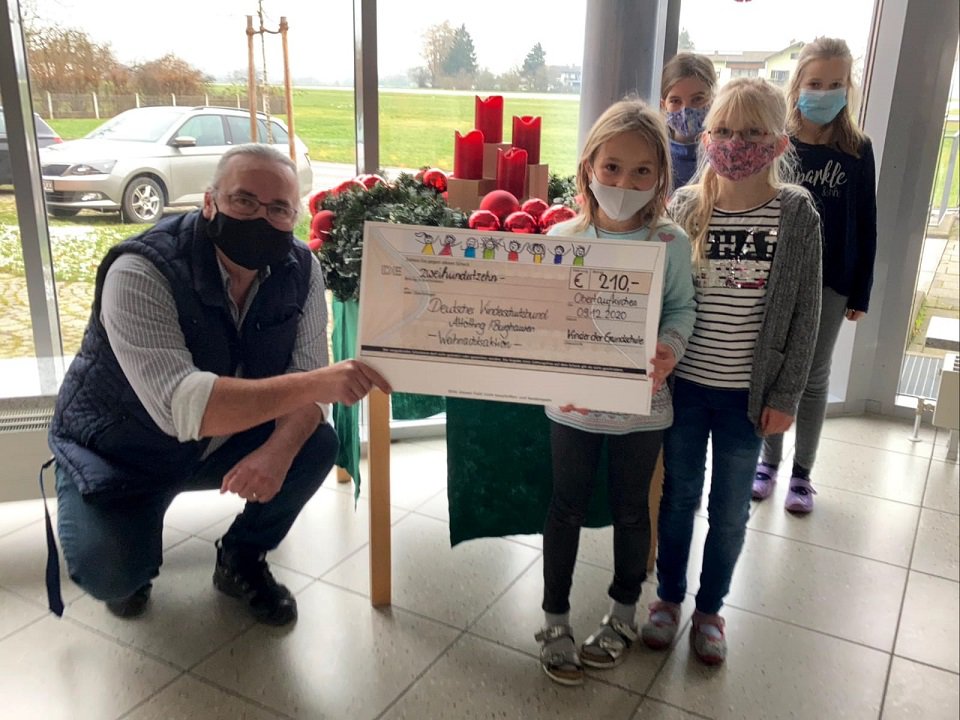 Symbolisch für alle Kinder der Schule übergaben vier Mädchen zusammen mit Schulleiter, Herr Christian Hofer stolz dem Kinderschutzbund einen Scheck über 210,--€.